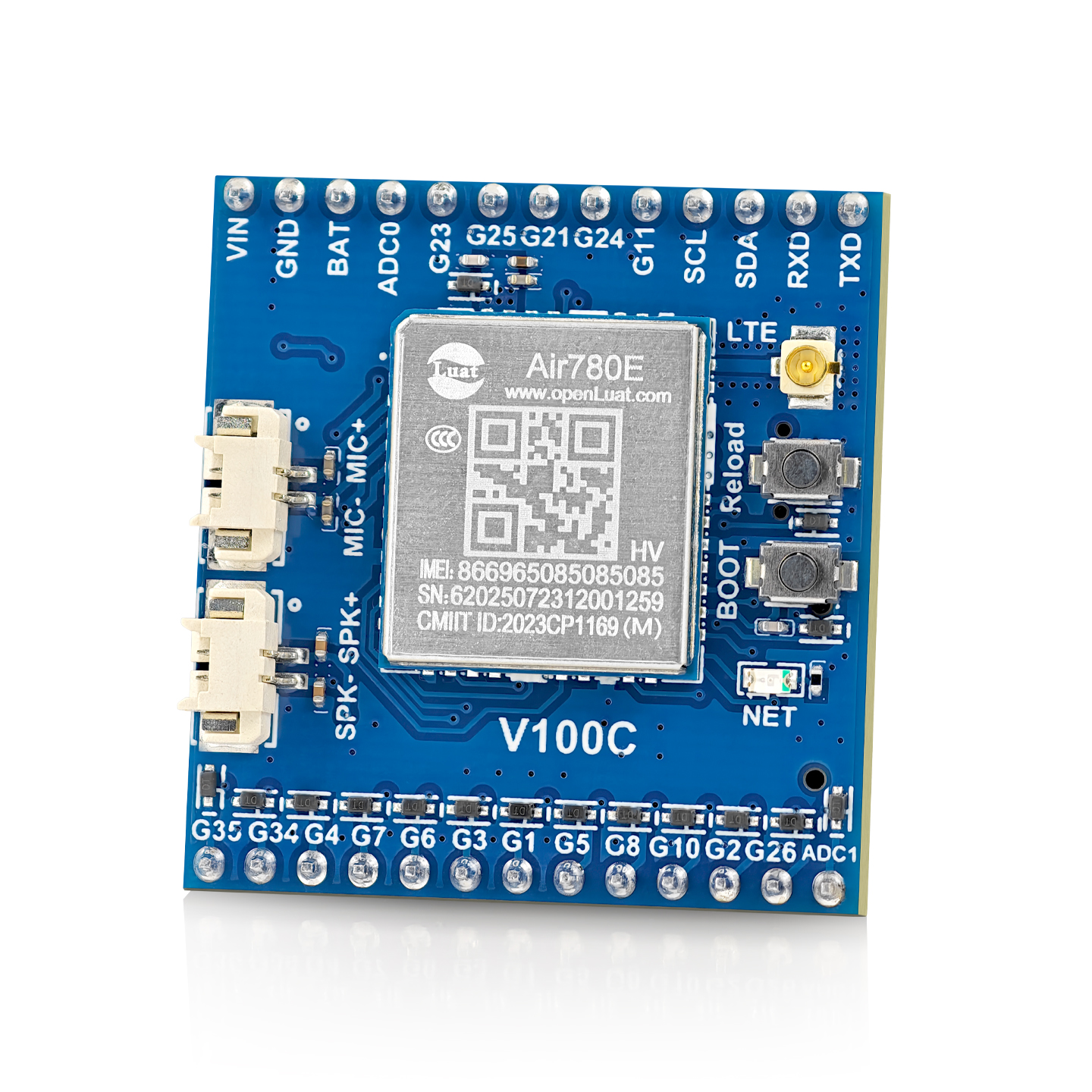 5~36V直流供电或3.3~4.2V电池供电 | 2.54mm 12PIN双排排针 | 1路TTL串口 | 1路TTS、1路MIC | 2路模拟量输入